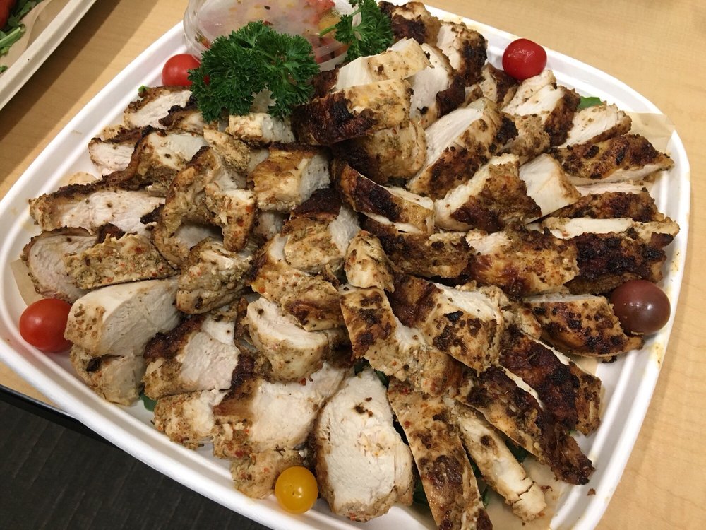 Inspired by a recipe from Ottolenghi, this dish is composed of roasted eggplant rounds topped with bulgur wheat, preserved lemons, golden raisins & toasted almonds with chermoula yogurt. Vegan option is available. emvegetarian/em p class"note"Priced per platter (serves 10 as entrée)/p